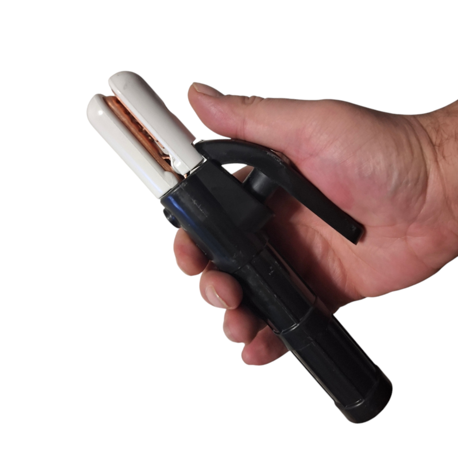 Сварочный пружинный держатель предназначен для зажима и удержания электродов с током не более 300 А. Пластиковые ручки являются изолятором, но при этом важно, чтобы электроведущие части держателя не соприкасались со свариваемым изделием или руками человека.