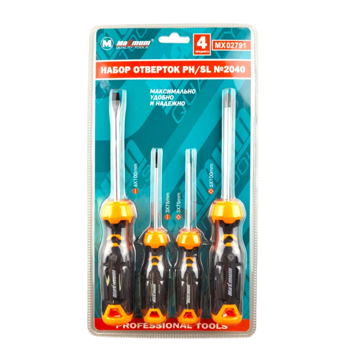 Набор профессиональных отверток от «Maximum» N 2040 содержит самые универсальные размеры и шлицы, которые применяются со всеми видами крепежа, имеющие внутренний рабочий профиль РН (крест) и SL (шлиц прямой).