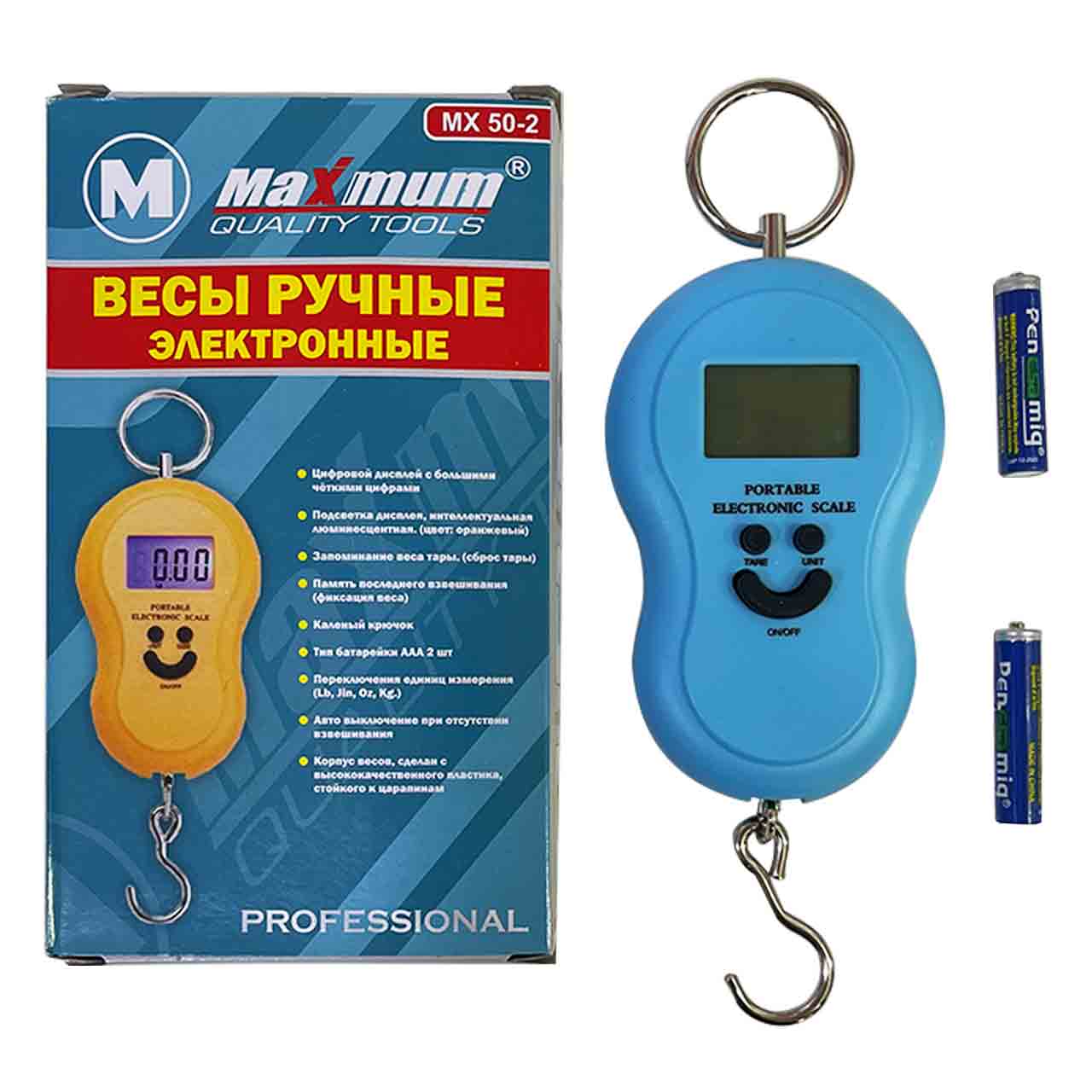 Яркий синий экран позволяет с лекгостью считать показатели. В комплекте с безменом Maximum Quality Tools — 2 батарейки ААА 1,5 В.